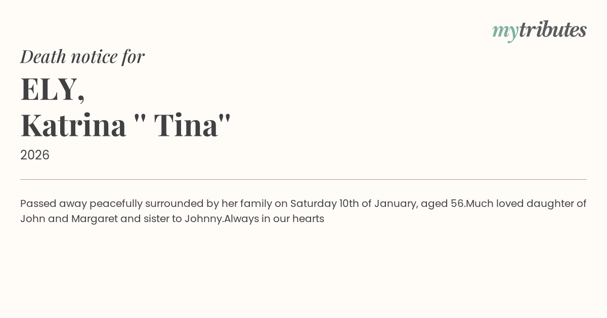 19°CPassed away peacefully surrounded by her family on Saturday 10th of January, aged 56.