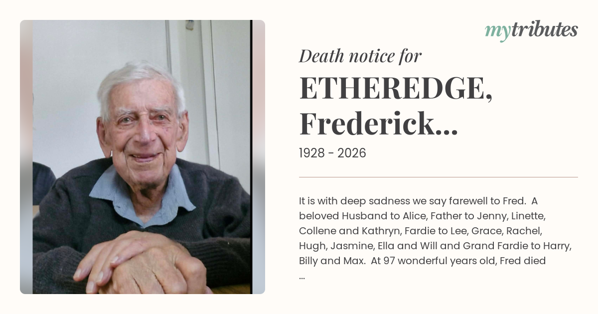 19°CIt is with deep sadness we say farewell to Fred. A beloved Husband to Alice, Father to Jenny, Linette, Collene and Kathryn, Fardie to Lee, Grace, Rachel, Hugh, Jasmine, Ella and Will and Grand Fardie to Harry, Billy and Max. At 97 wonderful years old, Fred died peacefully in his own bed surrounded by his family. Beloved and deeply missed now and always.