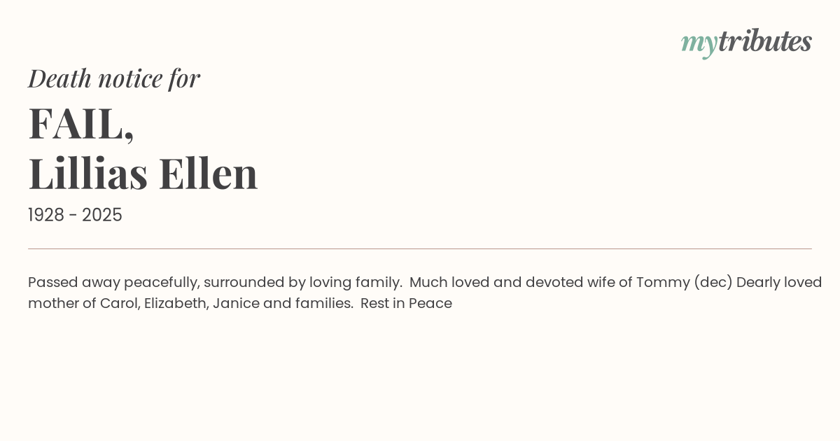 Dearly loved mother of Carol, Elizabeth, Janice and families.