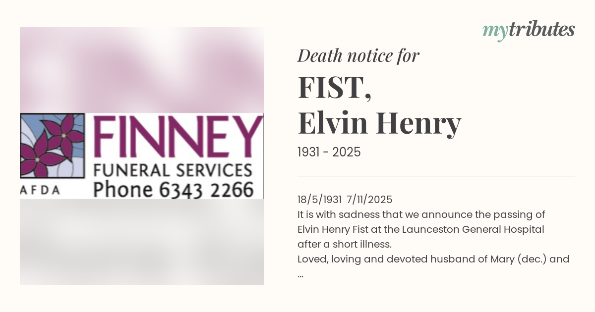 It is with sadness that we announce the passing of Elvin Henry Fist at the Launceston General Hospital after a short illness.
