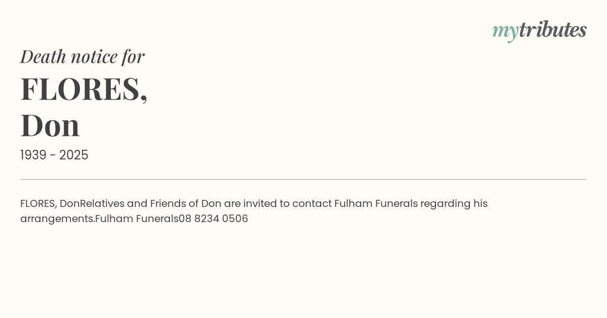 Relatives and Friends of Don are invited to contact Fulham Funerals regarding his arrangements.