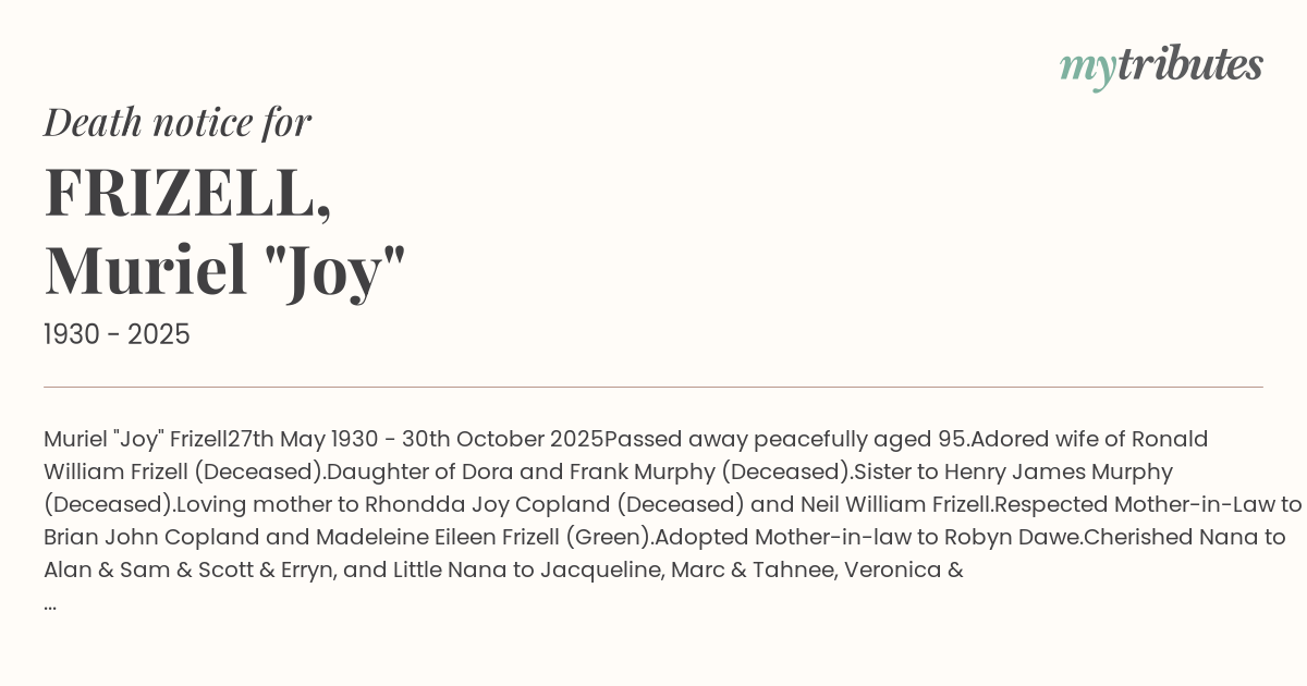Loving mother to Rhondda Joy Copland (Deceased) and Neil William Frizell.