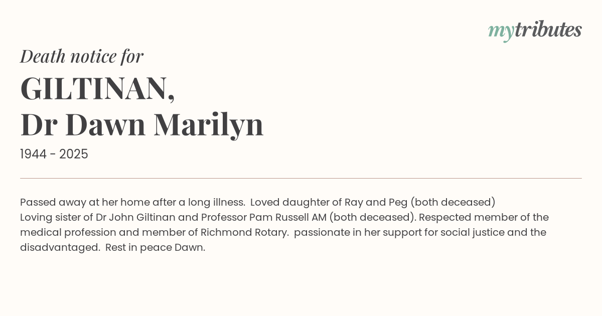 Loving sister of Dr John Giltinan and Professor Pam Russell AM (both deceased). Respected member of the medical profession and member of Richmond Rotary. passionate in her support for social justice and the disadvantaged. Rest in peace Dawn.