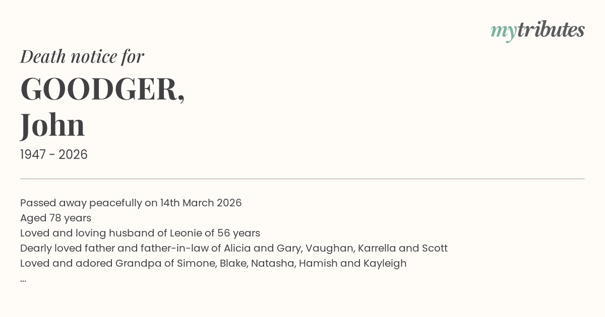 Dearly loved father and father-in-law of Alicia and Gary, Vaughan, Karrella and Scott