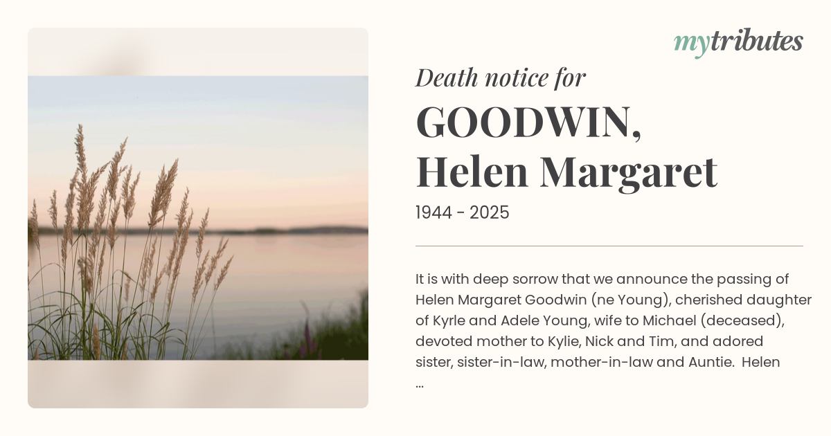 19°CIt is with deep sorrow that we announce the passing of Helen Margaret Goodwin (née Young), cherished daughter of Kyrle and Adele Young, wife to Michael (deceased), devoted mother to Kylie, Nick and Tim, and adored sister, sister-in-law, mother-in-law and Auntie.
