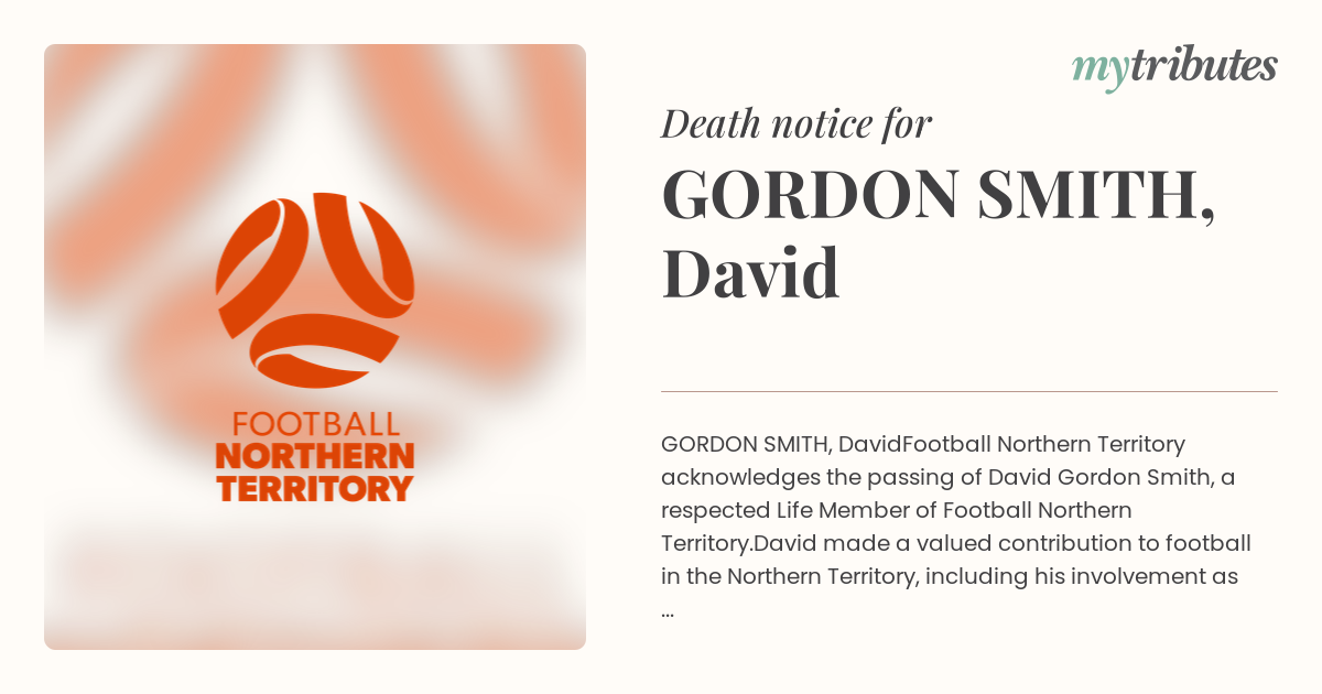 Football Northern Territory acknowledges the passing of David Gordon Smith, a respected Life Member of Football Northern Territory.