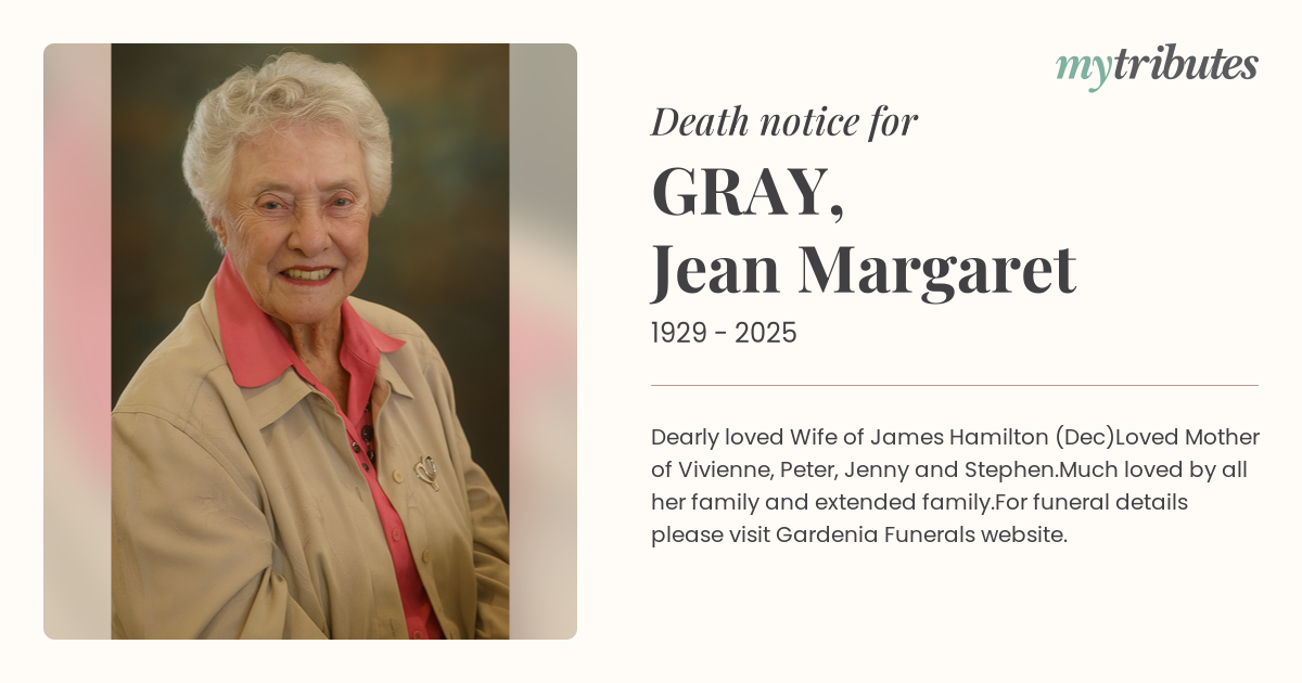 Loved Mother of Vivienne, Peter, Jenny and Stephen.