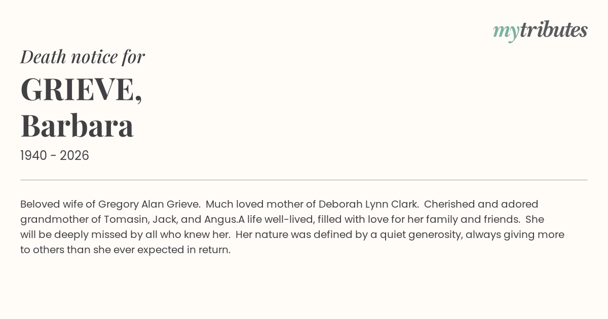 19°CBeloved wife of Gregory Alan Grieve. Much loved mother of Deborah Lynn Clark. Cherished and adored grandmother of Tomasin, Jack, and Angus.