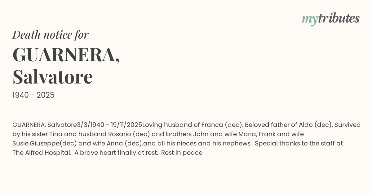 Loving husband of Franca (dec). Beloved father of Aldo (dec). Survived by his sister Tina and husband Rosario (dec) and brothers John and wife Maria, Frank and wife Susie,Giuseppe(dec) and wife Anna (dec).and all his nieces and his nephews.