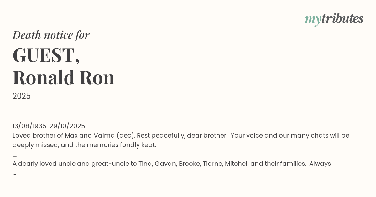A dearly loved uncle and great-uncle to Tina, Gavan, Brooke, Tiarne, Mitchell and their families. Always remembered with love and affection – his memory will remain in our hearts forever.