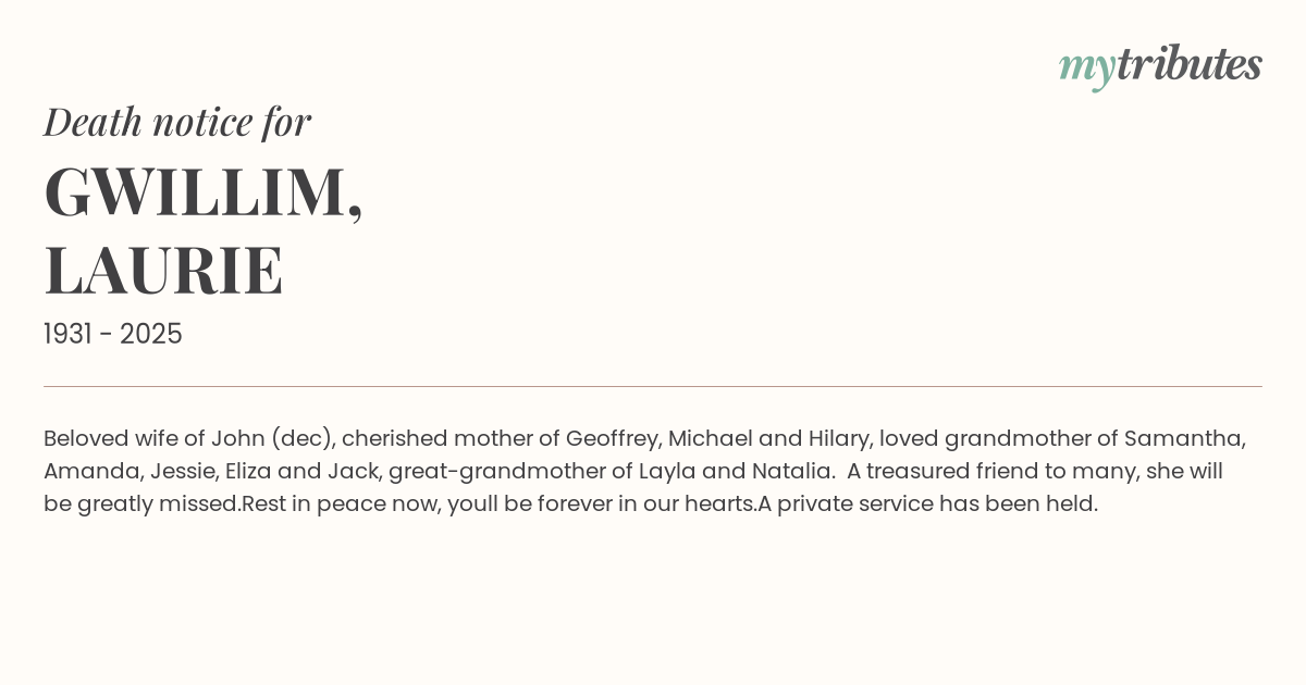 19°CBeloved wife of John (dec), cherished mother of Geoffrey, Michael and Hilary, loved grandmother of Samantha, Amanda, Jessie, Eliza and Jack, great-grandmother of Layla and Natalia.