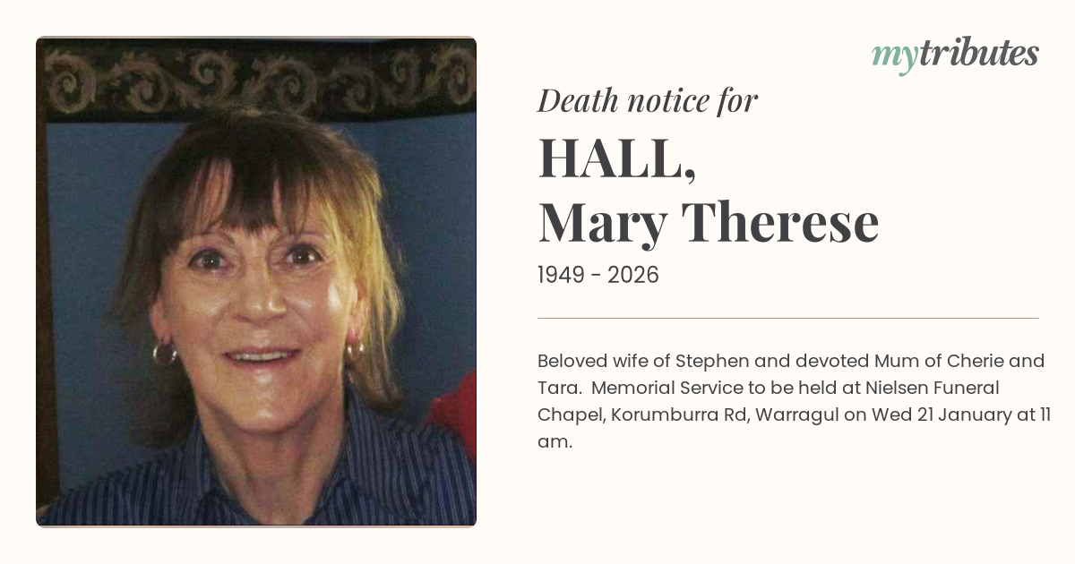19°CBeloved wife of Stephen and devoted Mum of Cherie and Tara. Memorial Service to be held at Nielsen Funeral Chapel, Korumburra Rd, Warragul on Wed 21 January at 11 am.