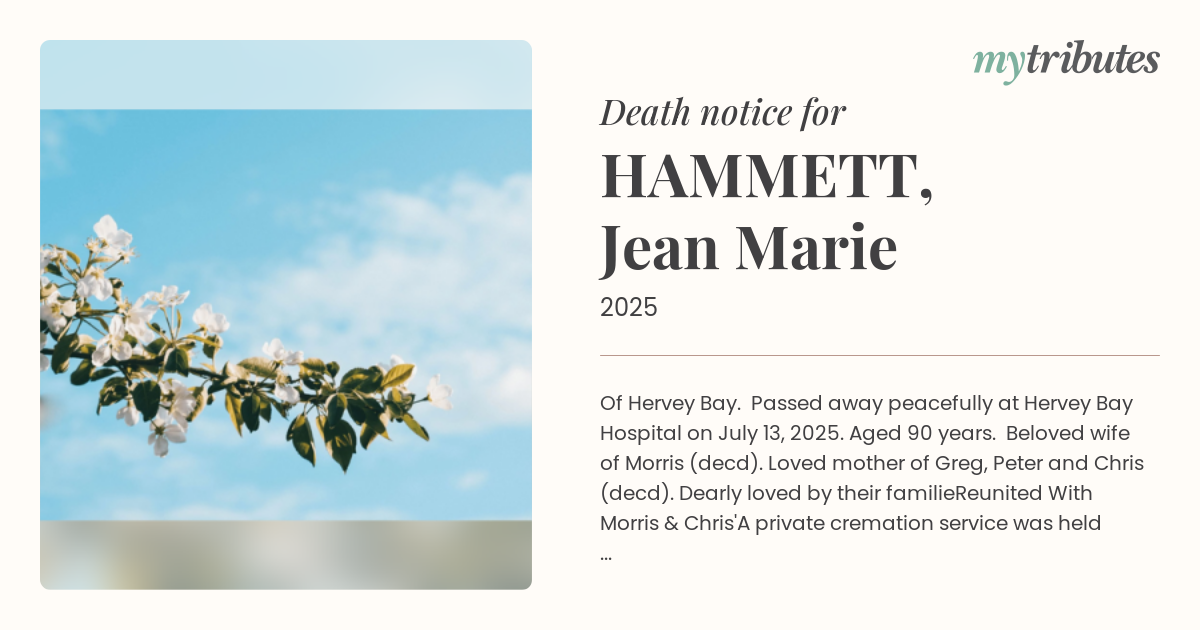 19°COf Hervey Bay. Passed away peacefully at Hervey Bay Hospital on July 13, 2025. Aged 90 years. Beloved wife of Morris (dec’d). Loved mother of Greg, Peter and Chris (dec’d). Dearly loved by their familie