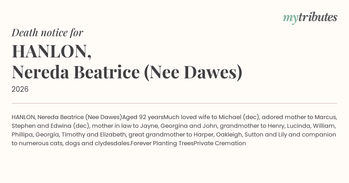 adored mother to Marcus, Stephen and Edwina (dec), mother in law to Jayne, Georgina and John, grandmother to Henry, Lucinda, William, Phillipa, Georgia,