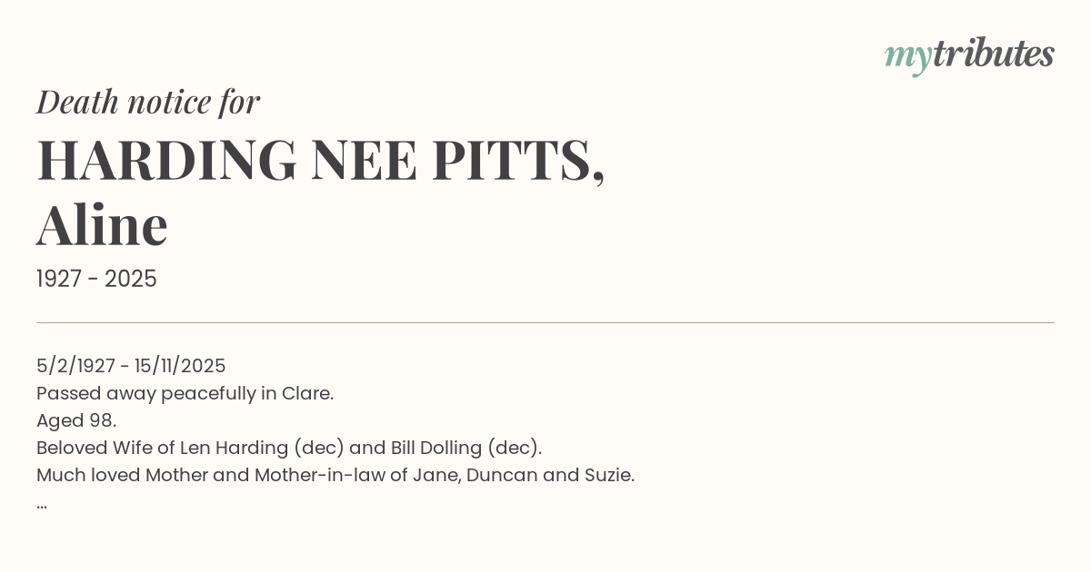 Beloved Wife of Len Harding (dec) and Bill Dolling (dec).