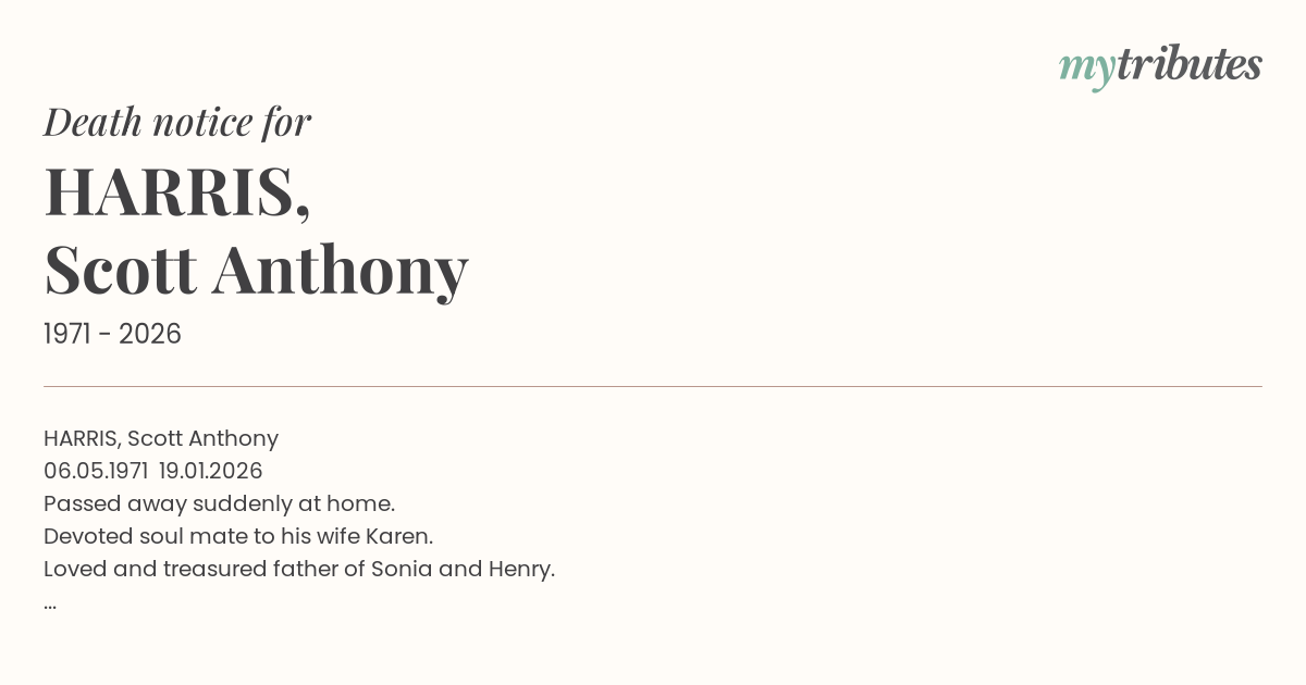 19°CHARRIS, Scott Anthony 06.05.1971 – 19.01.2026 Passed away suddenly at home. Devoted soul mate to his wife Karen. Loved and treasured father of Sonia and Henry. Beloved son of Bruce and Suzanne (both dec) and brother of Max. Adored son-in-law of Bryan and Marie (dec) Loved brother-in-law of Anthony, Mary and Dave and uncle to Matthew, Monica, John and Joel. One of the world’s most loyal and kind men, he will be missed by his family and friends. Finally resting in peace.