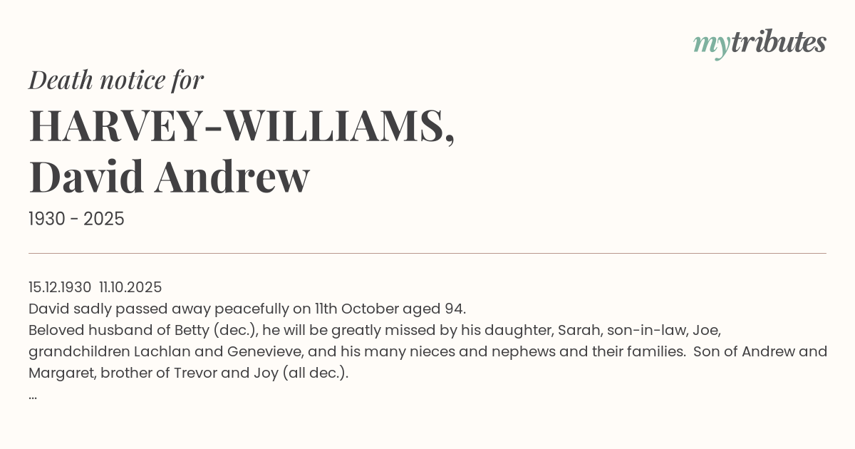 Beloved husband of Betty (dec.), he will be greatly missed by his daughter, Sarah, son-in-law, Joe, grandchildren Lachlan and Genevieve, and his many nieces and nephews and their families. Son of Andrew and Margaret, brother of Trevor and Joy (all dec.).