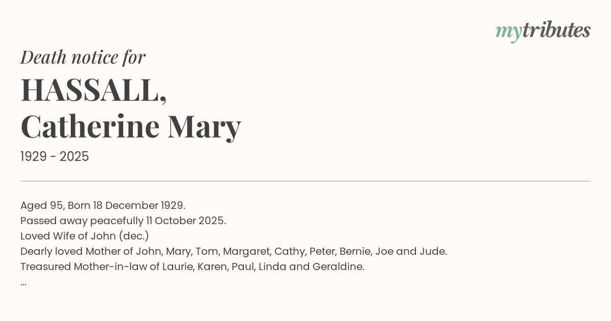 Dearly loved Mother of John, Mary, Tom, Margaret, Cathy, Peter, Bernie, Joe and Jude.