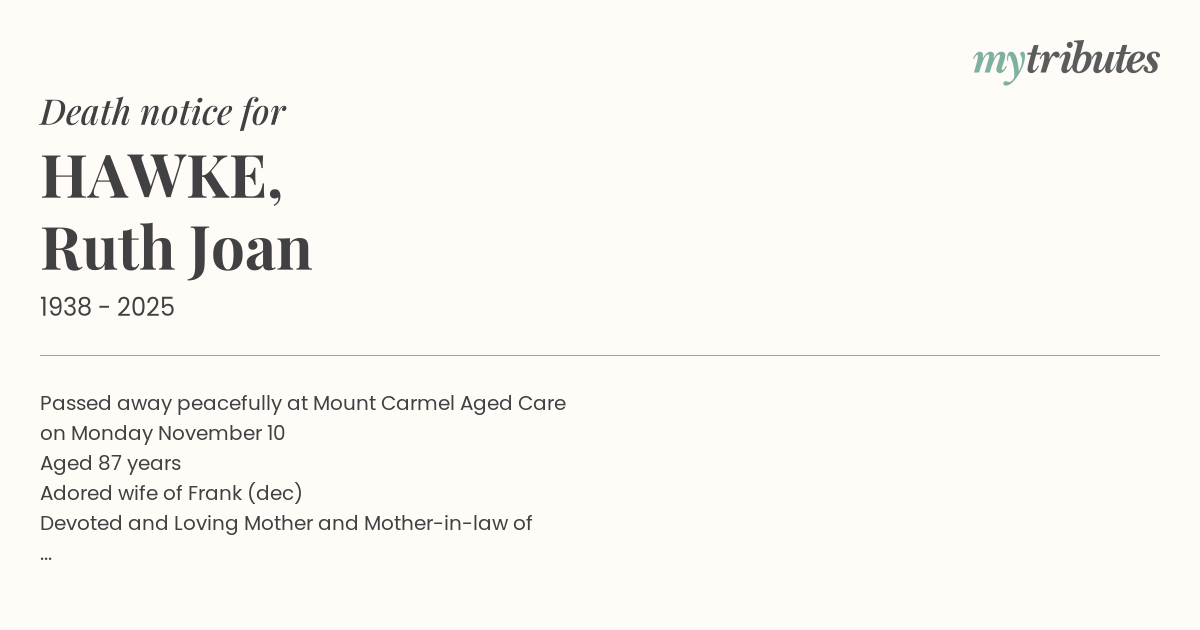 19°CPassed away peacefully at Mount Carmel Aged Care