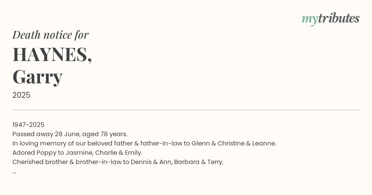 In loving memory of our beloved father & father-in-law to Glenn & Christine & Leanne. Adored Poppy to Jasmine, Charlie & Emily. Cherished brother & brother-in-law to Dennis & Ann, Barbara & Terry. Cherished uncle to Steven & David & Kirran, Angela & Tan (dec), Adam & Emma & their families.