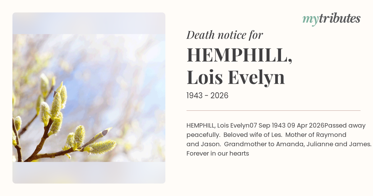 Passed away peacefully. Beloved wife of Les. Mother of Raymond and Jason. Grandmother to Amanda, Julianne and James.
