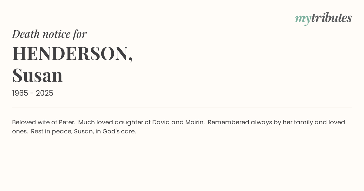 19°CBeloved wife of Peter. Much loved daughter of David and Moirin. Remembered always by her family and loved ones. Rest in peace, Susan, in God's care.