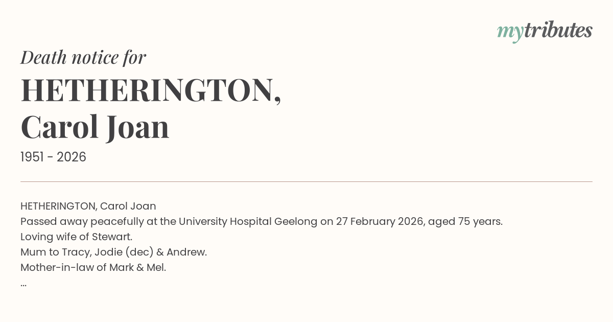 Passed away peacefully at the University Hospital Geelong on 27 February 2026, aged 75 years.