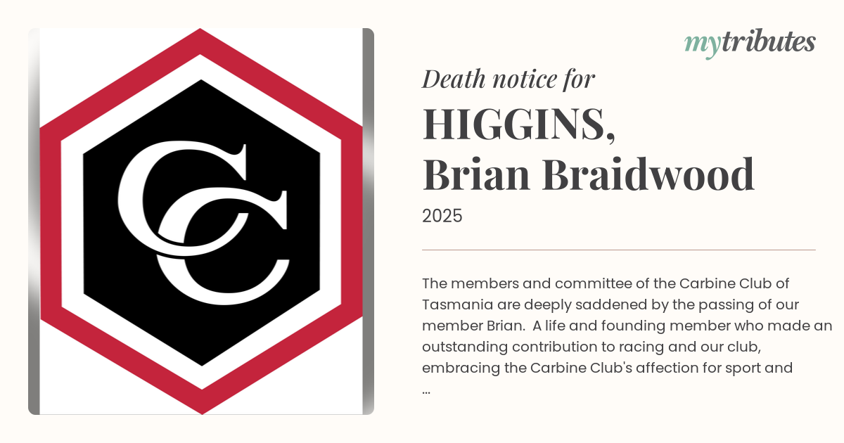 19°CThe members and committee of the Carbine Club of Tasmania are deeply saddened by the passing of our member Brian. A life and founding member who made an outstanding contribution to racing and our club, embracing the Carbine Club's affection for sport and good fellowship. Deepest sympathy to Brian's family and friends.