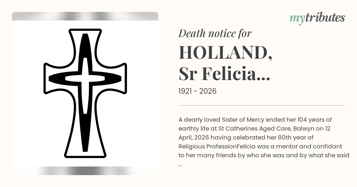 19°CA dearly loved Sister of Mercy ended her 104 years of earthly life at St Catherine’s Aged Care, Balwyn on 12 April, 2026 having celebrated her 80th year of Religious Profession