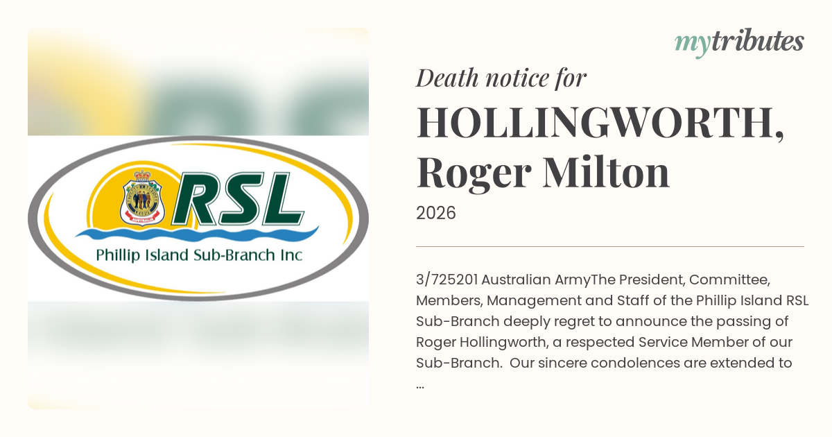 The President, Committee, Members, Management and Staff of the Phillip Island RSL Sub-Branch deeply regret to announce the passing of Roger Hollingworth, a respected Service Member of our Sub-Branch. Our sincere condolences are extended to The Hollingworth Family