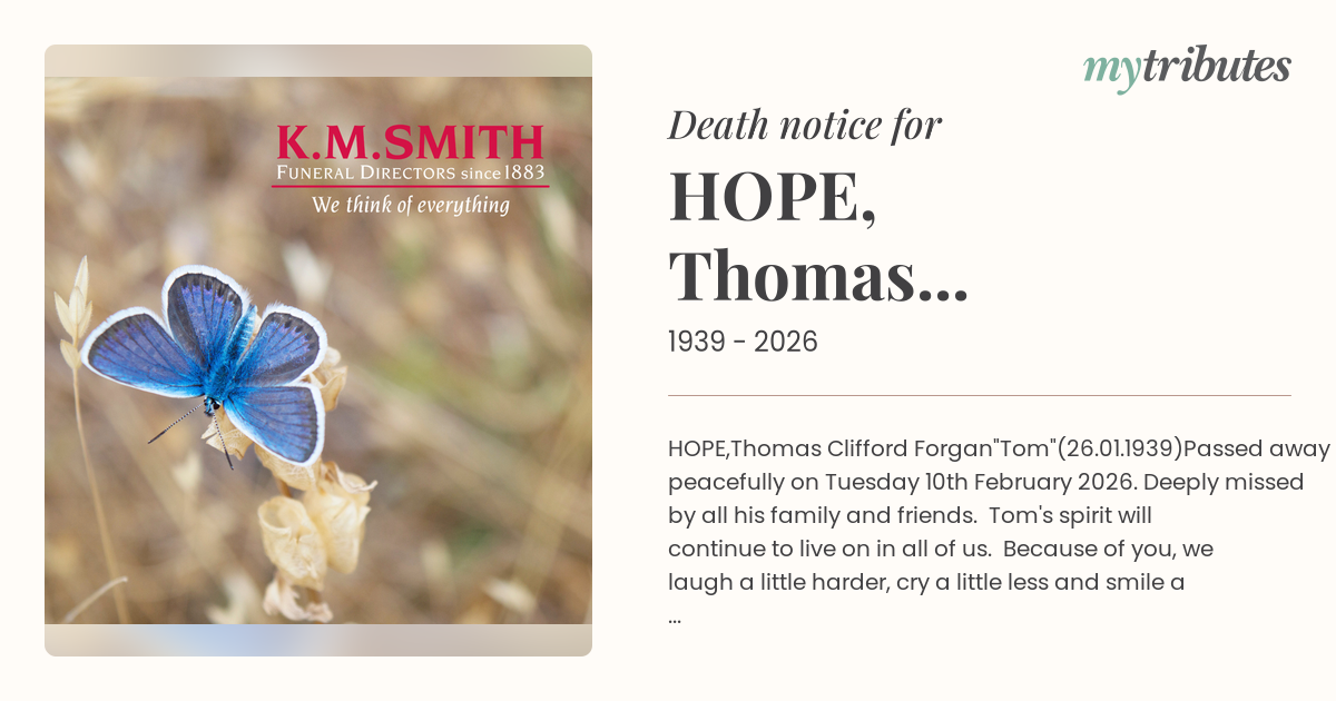 Passed away peacefully on Tuesday 10th February 2026. Deeply missed by all his family and friends. Tom's spirit will continue to live on in all of us. Because of you, we laugh a little harder, cry a little less and smile a lot more.