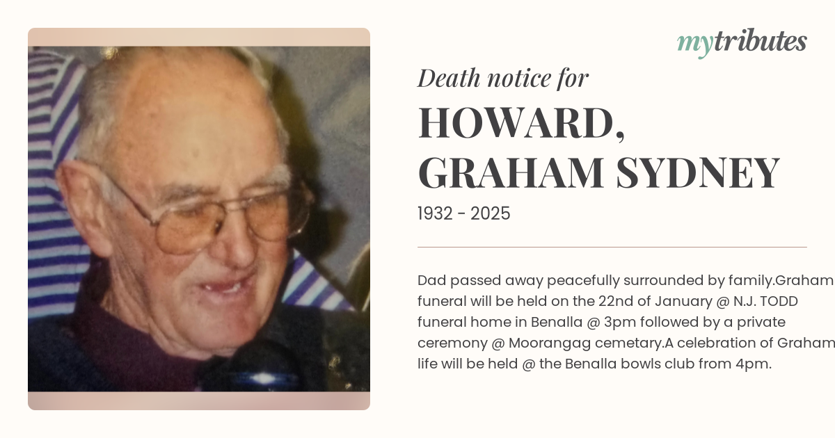 Grahams funeral will be held on the 22nd of January @ N.J. TODD funeral home in Benalla @ 3pm followed by a private ceremony @ Moorangag cemetary.