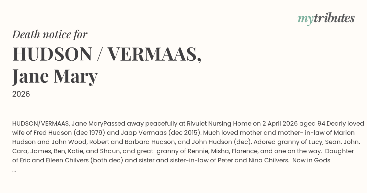Dearly loved wife of Fred Hudson (dec 1979) and Jaap Vermaas (dec 2015). Much loved mother and mother- in-law of Marion Hudson and John Wood, Robert and Barbara Hudson, and John Hudson (dec). Adored granny of Lucy, Sean, John, Cara, James, Ben, Katie, and Shaun, and great-granny of Rennie, Misha, Florence, and one on the way. Daughter of Eric and Eileen Chilvers (both dec) and sister and sister-in-law of Peter and Nina Chilvers.