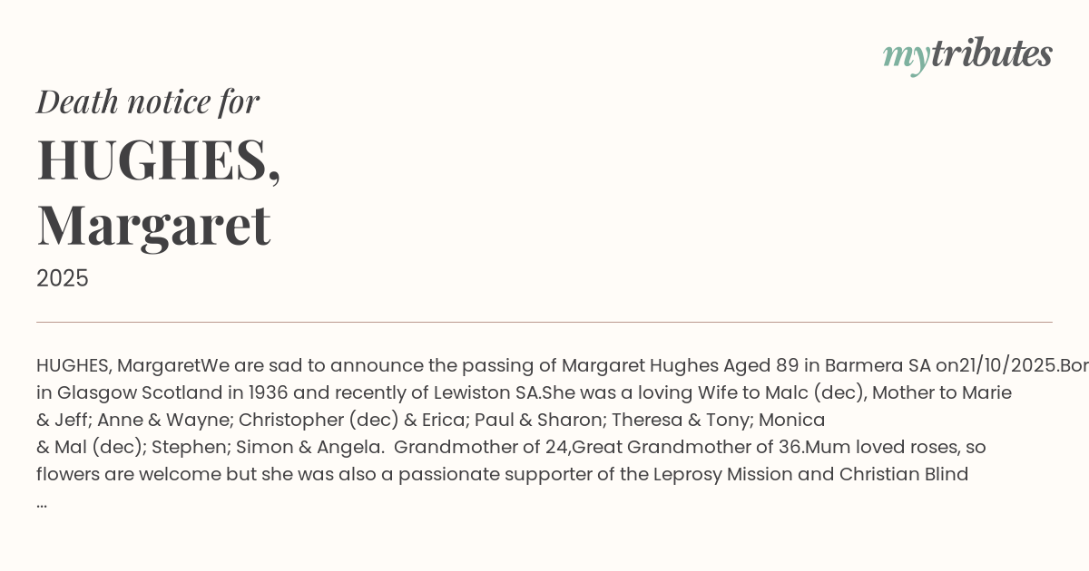 We are sad to announce the passing of Margaret Hughes Aged 89 in Barmera SA on