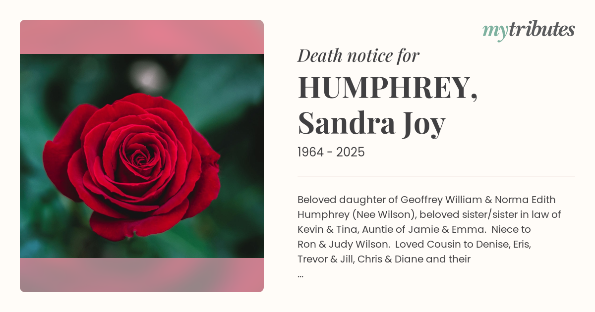 19°CBeloved daughter of Geoffrey William & Norma Edith Humphrey (Nee Wilson), beloved sister/sister in law of Kevin & Tina, Auntie of Jamie & Emma. Niece to Ron & Judy Wilson. Loved Cousin to Denise, Eris, Trevor & Jill, Chris & Diane and their families.