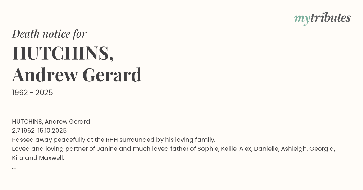Loved and loving partner of Janine and much loved father of Sophie, Kellie, Alex, Danielle, Ashleigh, Georgia, Kira and Maxwell.