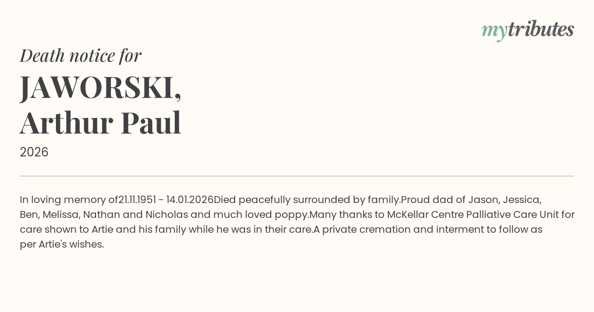 Many thanks to McKellar Centre Palliative Care Unit for care shown to Artie and his family while he was in their care.