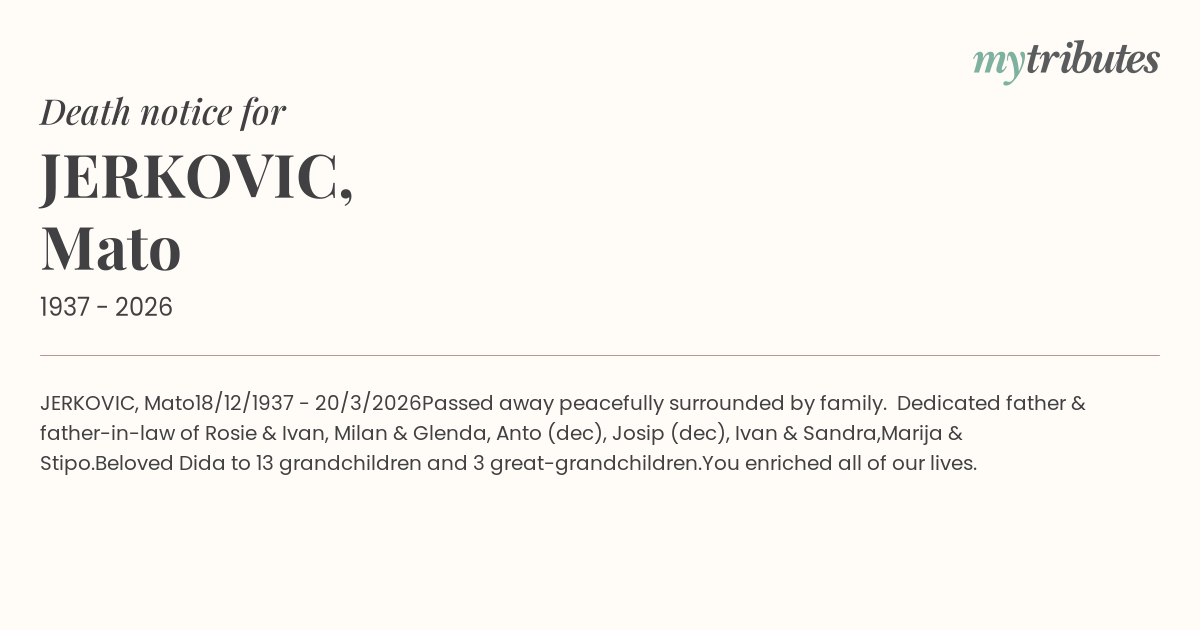 Passed away peacefully surrounded by family. Dedicated father & father-in-law of Rosie & Ivan, Milan & Glenda, Anto (dec), Josip (dec), Ivan & Sandra,Marija & Stipo.