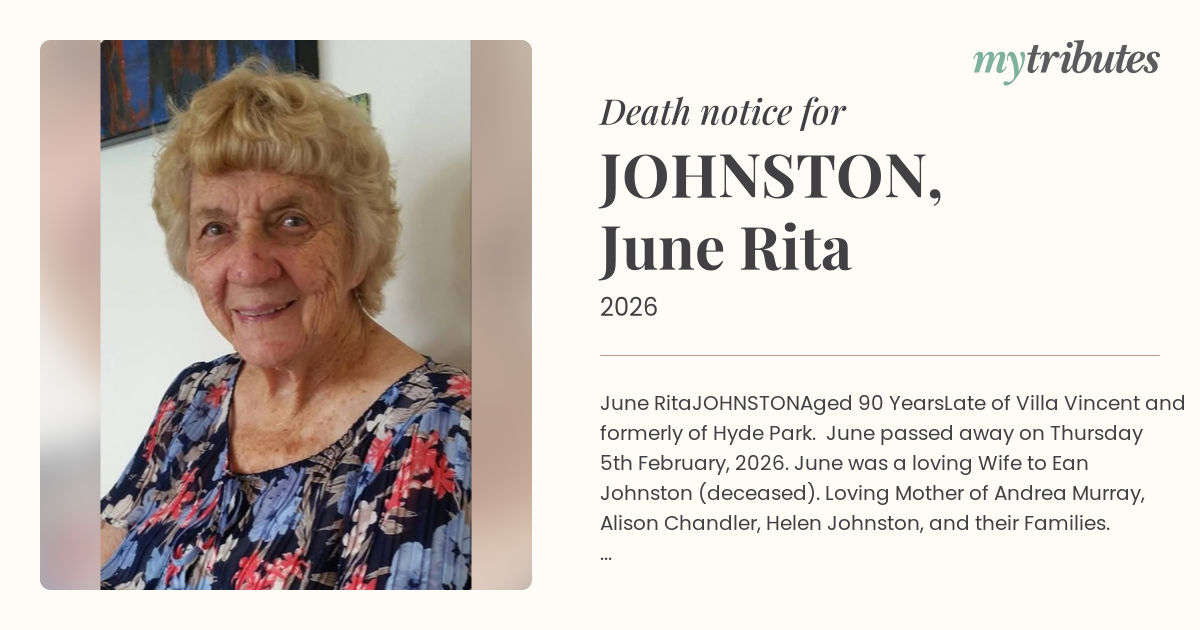 Late of Villa Vincent and formerly of Hyde Park. June passed away on Thursday 5th February, 2026. June was a loving Wife to Ean Johnston (deceased). Loving Mother of Andrea Murray, Alison Chandler, Helen Johnston, and their Families. Nana to Emma, Brooke and Abbey.
