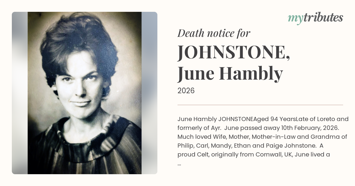 Late of Loreto and formerly of Ayr. June passed away 10th February, 2026. Much loved Wife, Mother, Mother-in-Law and Grandma of Philip, Carl, Mandy, Ethan and Paige Johnstone. A proud Celt, originally from Cornwall, UK, June lived a life full of adventure, travelling and teaching across Europe, Kenya, Papua New Guinea and Australia. She will be very much missed by her Family and all that knew her.