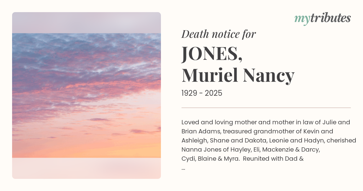 19°CLoved and loving mother and mother in law of Julie and Brian Adams, treasured grandmother of Kevin and Ashleigh, Shane and Dakota, Leonie and Hadyn, cherished Nanna Jones of Hayley, Eli, Mackenzie & Darcy, Cydi, Blaine & Myra. Reunited with Dad & Trevor. Now at peace in God's beautiful garden. Mum, we will love and remember you always.