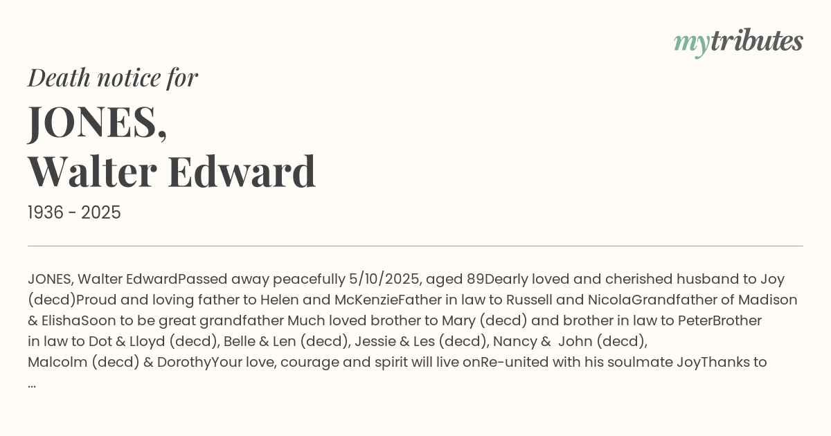 Passed away peacefully 5/10/2025, aged 89