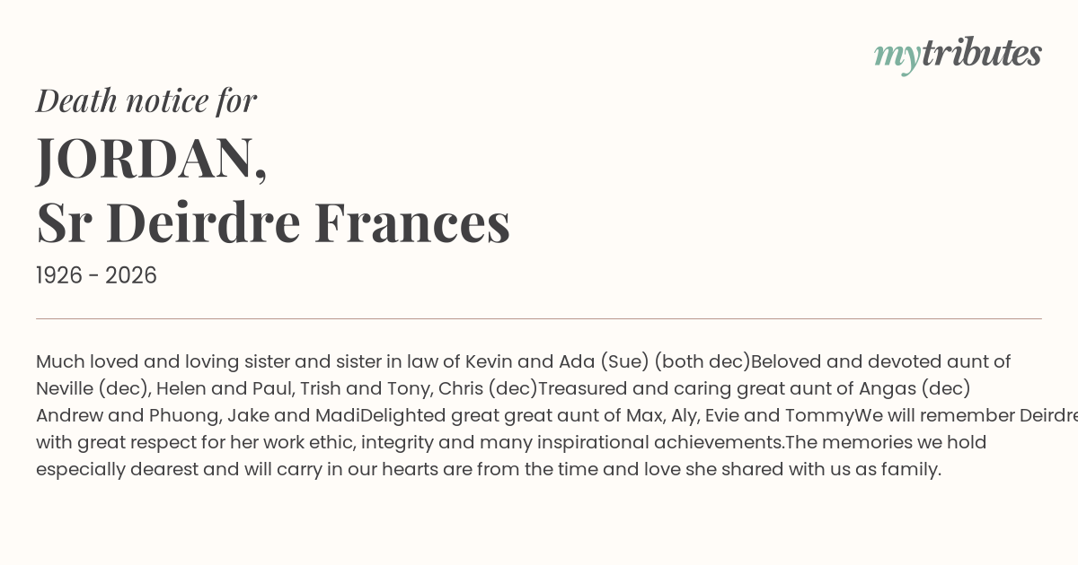 19°CMuch loved and loving sister and sister in law of Kevin and Ada (Sue) (both dec)