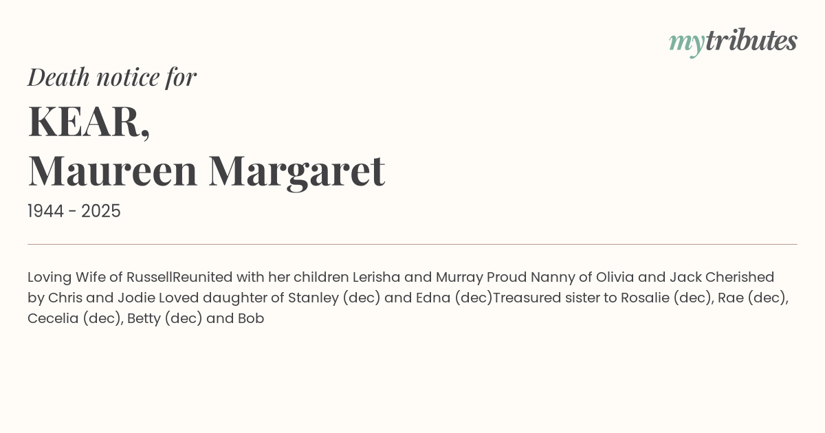 Treasured sister to Rosalie (dec), Rae (dec), Cecelia (dec), Betty (dec) and Bob