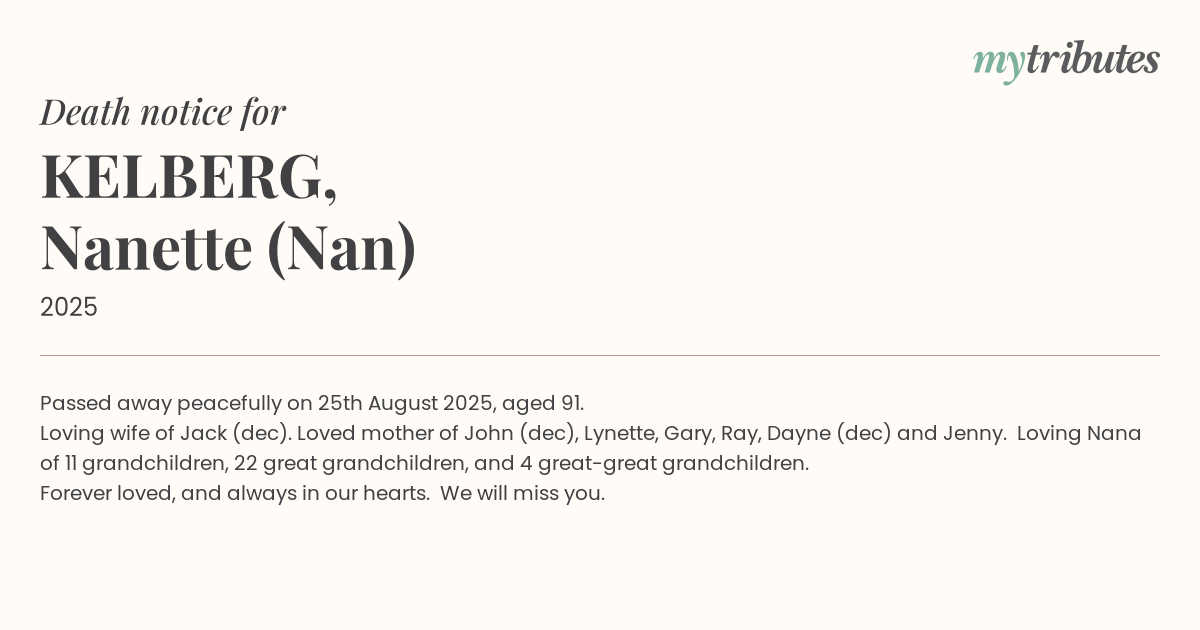 Loving wife of Jack (dec). Loved mother of John (dec), Lynette, Gary, Ray, Dayne (dec) and Jenny. Loving Nana of 11 grandchildren, 22 great grandchildren, and 4 great-great grandchildren.