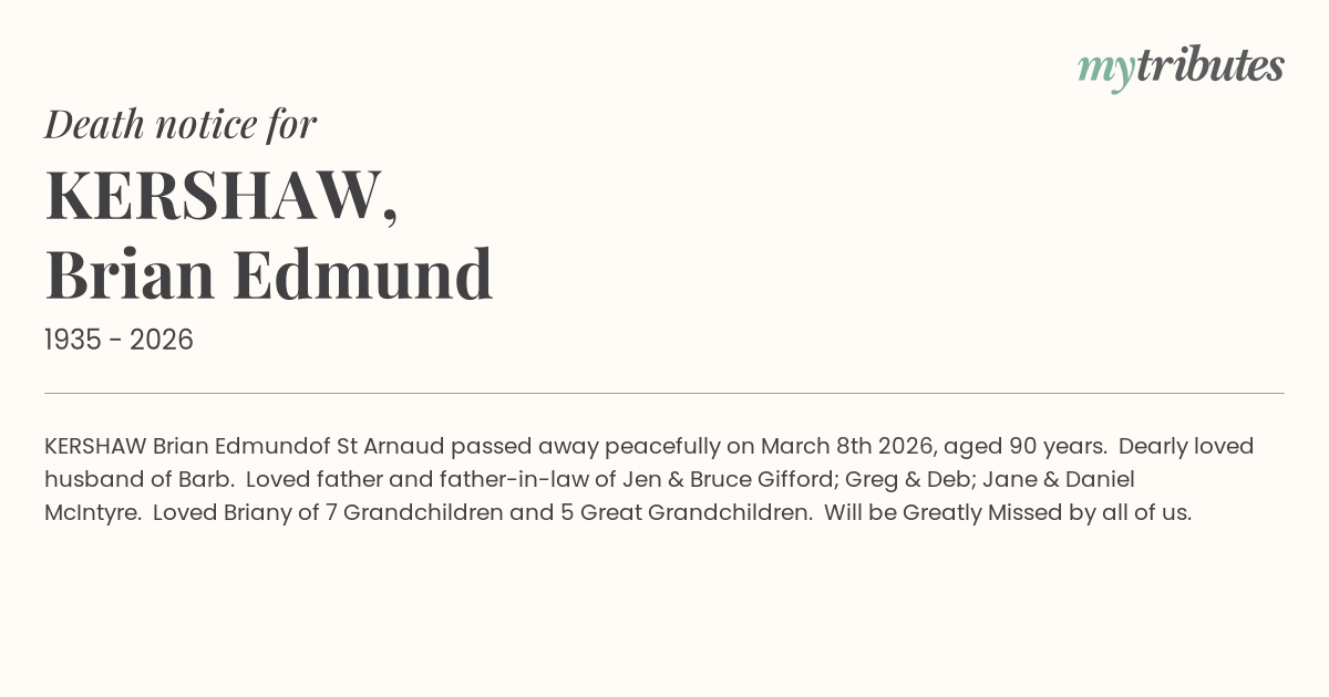 of St Arnaud passed away peacefully on March 8th 2026, aged 90 years. Dearly loved husband of Barb. Loved father and father-in-law of Jen & Bruce Gifford; Greg & Deb; Jane & Daniel McIntyre. Loved Briany of 7 Grandchildren and 5 Great Grandchildren.