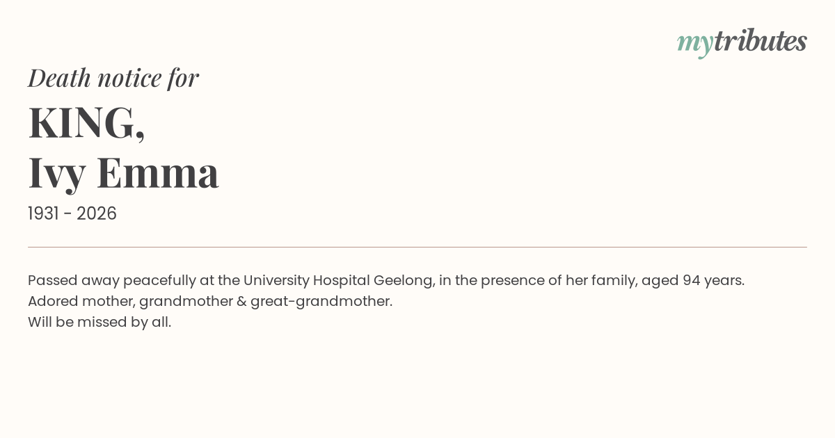 19°CPassed away peacefully at the University Hospital Geelong, in the presence of her family, aged 94 years. Adored mother, grandmother & great-grandmother. Will be missed by all.