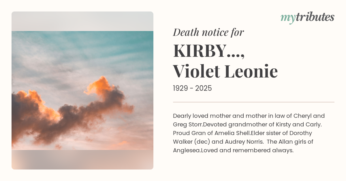 19°CDearly loved mother and mother in law of Cheryl and Greg Storr.