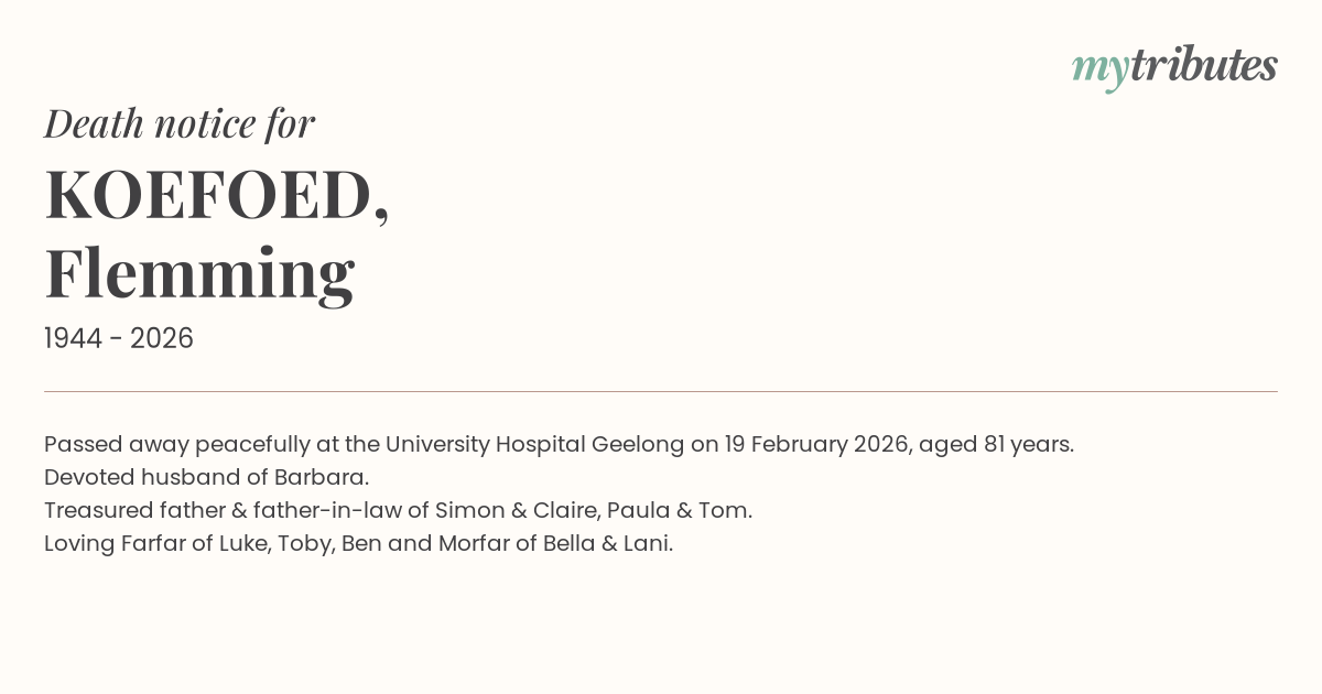 19°CPassed away peacefully at the University Hospital Geelong on 19 February 2026, aged 81 years.