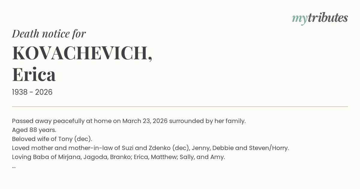 Loved mother and mother-in-law of Suzi and Zdenko (dec), Jenny, Debbie and Steven/Horry.